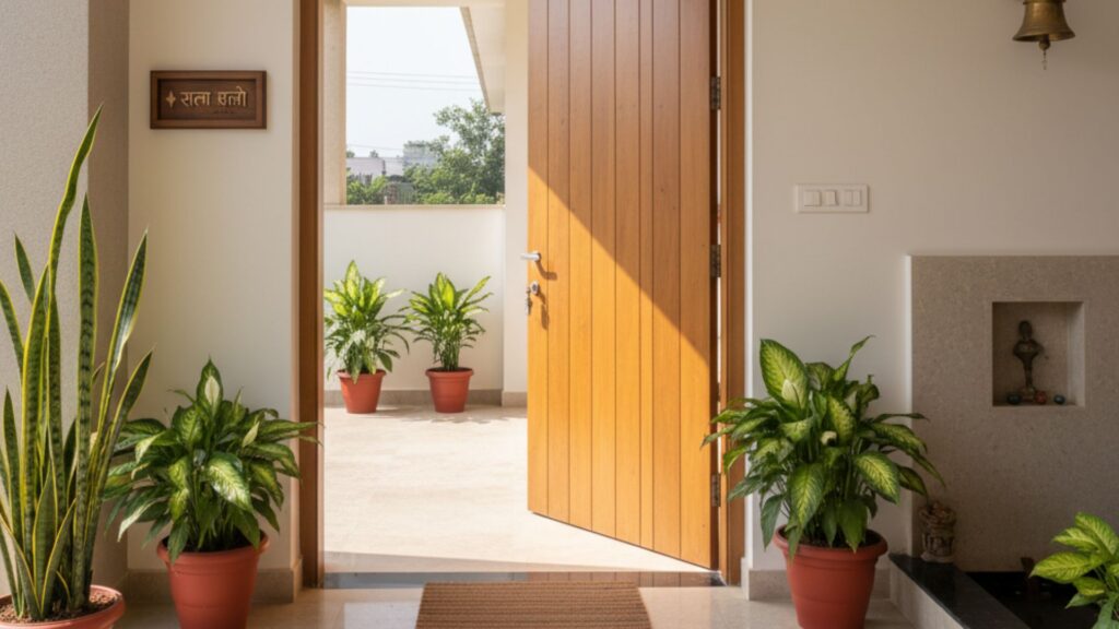 - Clutter-free and bright: Keep the doorway clean, well-lit, and welcoming. Avoid placing shoes, umbrellas, or unnecessary items near the main door.